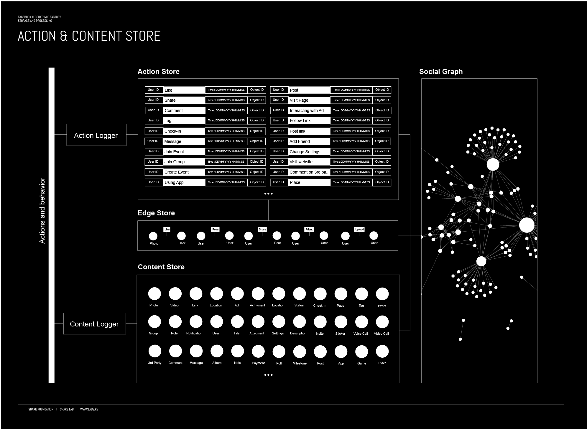 Those structures are buildings of the Facebook Factory, architecture where resource materials, data that is extracted from our behaviour is stored and prepared for the algorithmic workers to deal with. In next chapter we will explore the anatomy of some of the most interesting Facebook workers – algorithms that are transforming behavioural data into a final product.