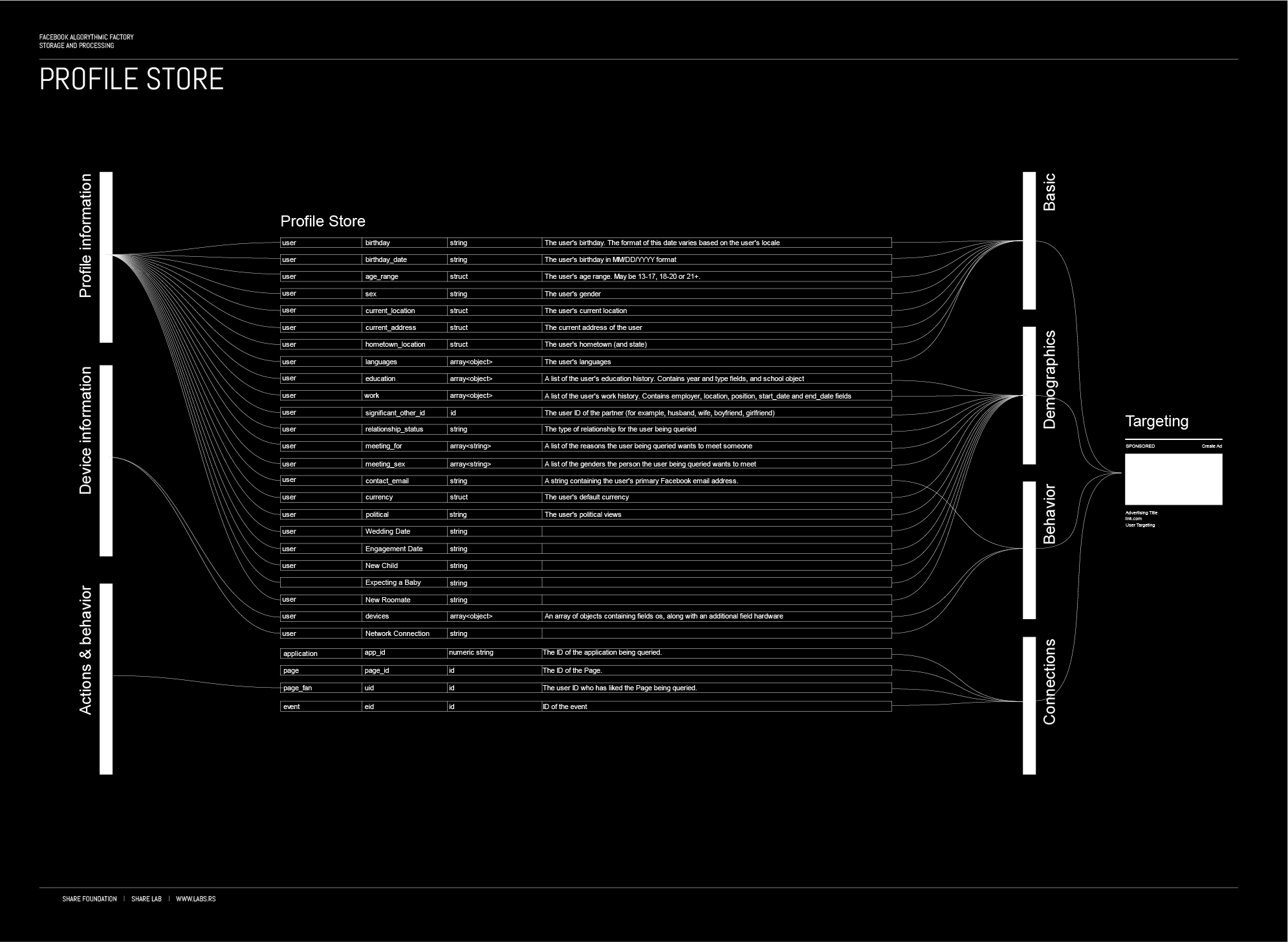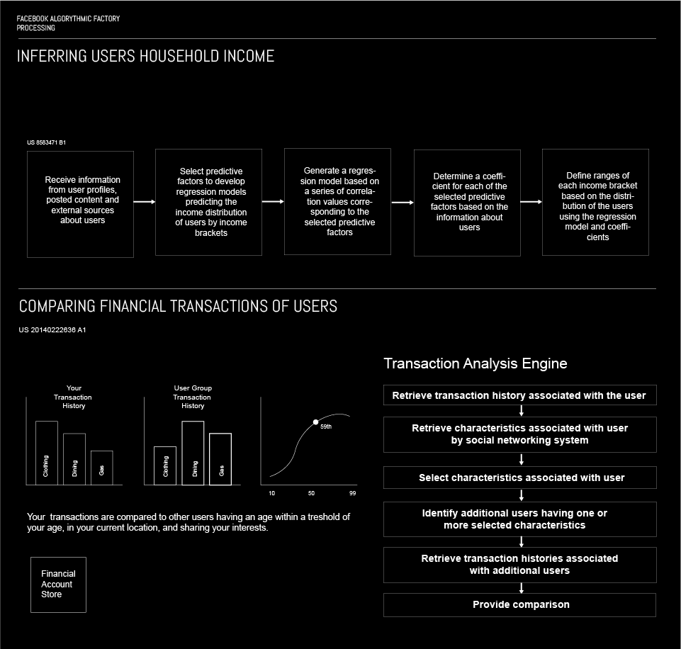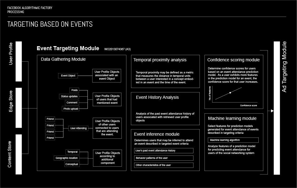 Research tools and methodology :  how data is stored and what kind of algorithms are inside is the hardest part to investigate. Luckily we found a source of knowledge that gave us some kind of insight into those mysterious algorithmic  processes: database of all publicly available Facebook patents. We found around 8000 different patents registered by Facebook. Based on them we created possible interpretation of what happens within  the black box. Another lead and source of information for us was Facebook Graph API, primary way for third party developers to get data in and out of Facebook’s platform.