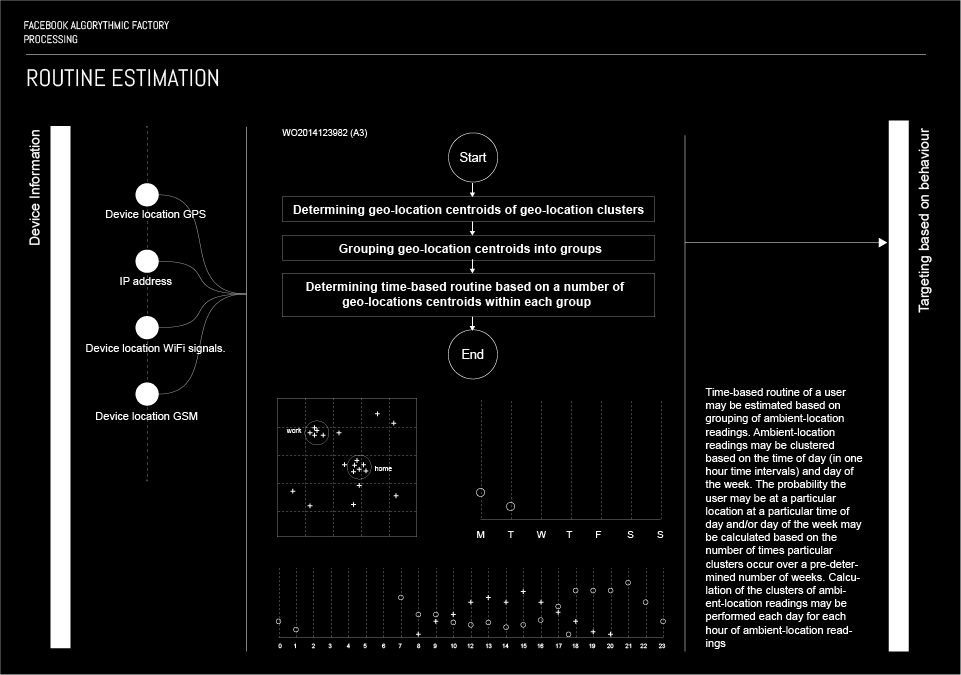This algorithm determines the routines of a user by analysing the geolocation of a user over a period of time in hourly intervals. The algorithm uses data about user’s geolocation provided by mobile devices, such as smartphones, tablets or laptops, or rather sensors installed in these devices, i.e. GPS sensor, gyroscope or a compass; the Facebook app installed on the device gathers the necessary data and feeds them to the algorithm. Next, the algorithm analyses the repetition, or the user being at the same location at a certain hour on a certain day of the week. The algorithm then clusters these geolocation centroids; afterwards the clusters are labeled by a place that corresponds to the geolocation centroids in the cluster. In that manner, the algorithm can determine where the user lives, where they work, if they go to the farmer’s market on a saturday morning, do they go to the gym and how frequently etc.