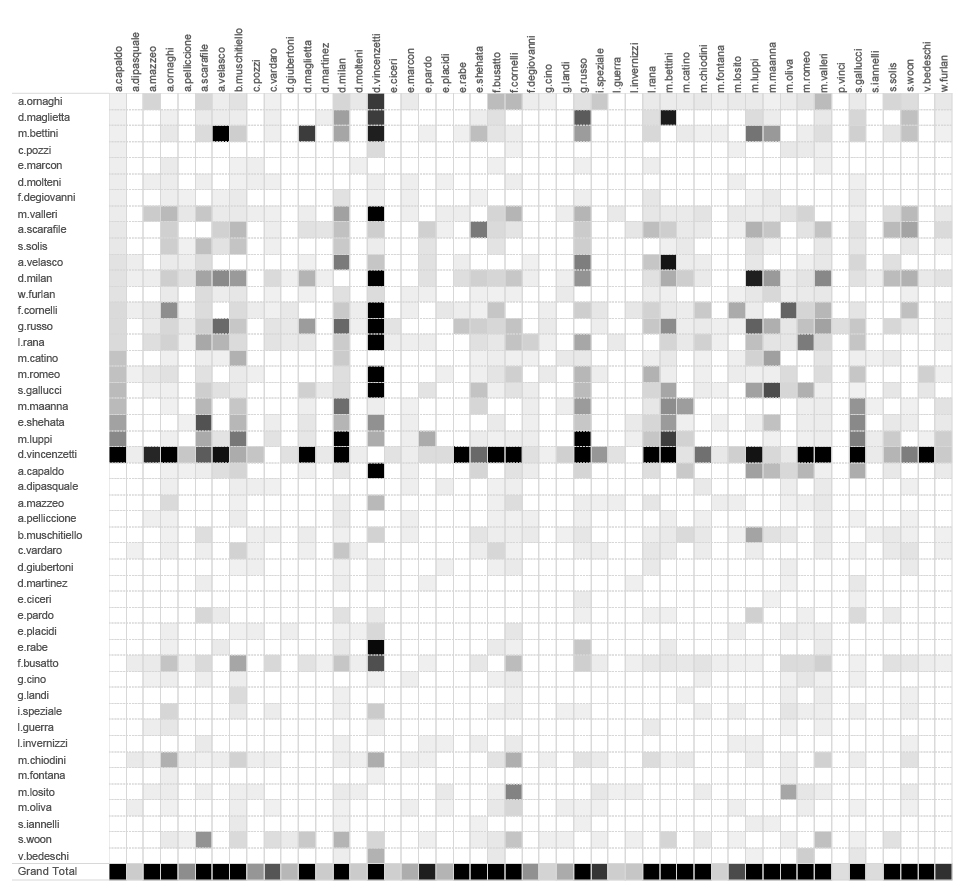 By spotting the darker squares we can explore individual ties between different employees within organisation. D. Vincenzetti is clearly the main actor in this graph, but we can also notice a few other strong relations across this heatmap, that can help us get a better insight into their organisational structure.