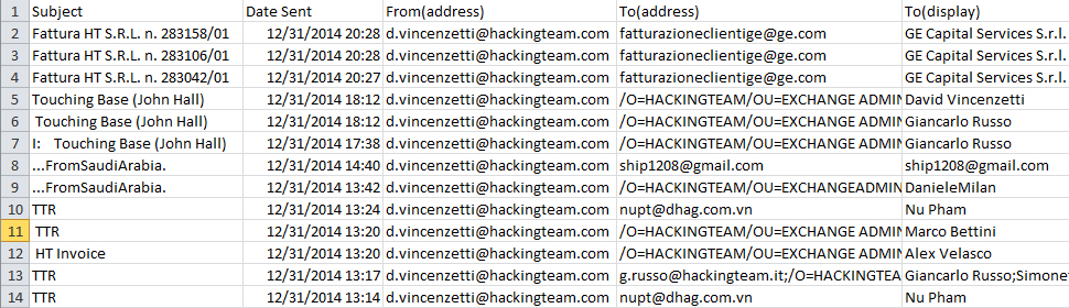 After extracting data from around 60 accounts and hundreds of thousands emails of Hacking Team employees, we got a database we could work with.