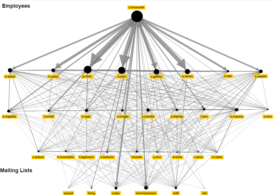 According to the previous phases of our metadata investigation, an obvious choice of a node (person) with the biggest amount of internal and external contacts and communication is d.vincenzetti@hackingteam.com. We will call him Mr.D.