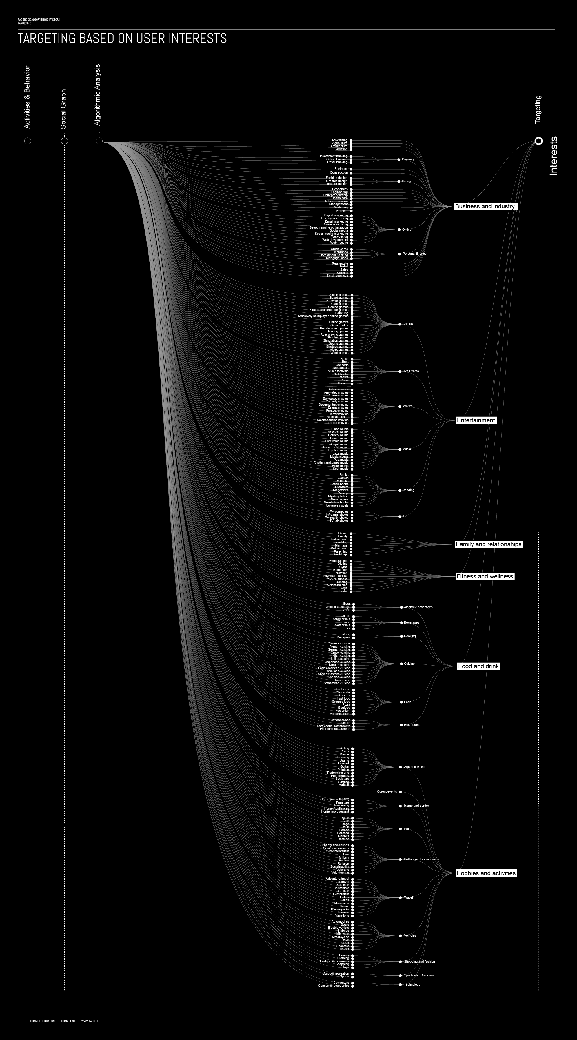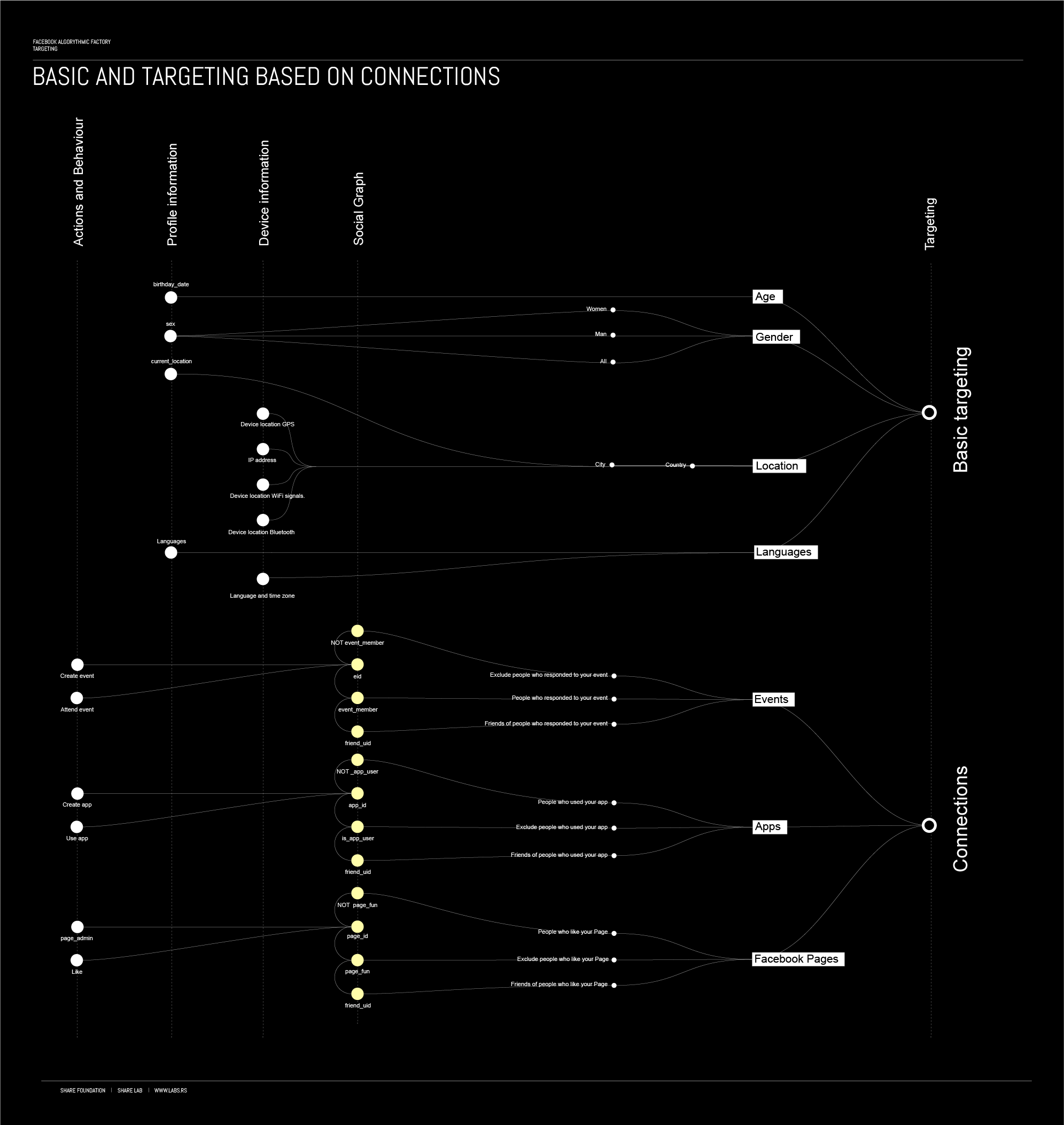 In order to map this process we examined the structure, categorisation and targeting methods available to advertisers through Facebook. There are 3 main categories of targeting options, user profiling based on basic information (location, age, gender and language), detailed targeting (based on users’ demographics, interests and behaviours) and connections (based on specific kind of connection to Facebook pages, apps or events). Every user is basicly profiled and tagged with the use of those three methods and is being offered as a target for advertising. Facebook’s revenue ($ 17.93bn in 2015) directly depends on the user profiling quality. The more accurate the user profiles are, the better product offered to advertisers they become. The ultimate product of Facebook’s surveillance economy is a deep insight into your interests and behaviour patterns, exact knowledge who you really are and prediction how you will eventually behave in the future, packed in user profiles.